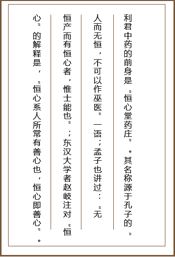 利君中藥具有近400年的悠久歷史。公司前身“恒心堂藥莊”始創(chuàng)于明朝末期,興盛于清代、民國(guó),其招牌產(chǎn)品“坎壢妙濟(jì) 丹”、“參茸固本還少丹”功能獨(dú)特、療效神奇,享譽(yù)廣大西部地區(qū),有“神農(nóng)妙濟(jì)”之美譽(yù),歷代名人左宗棠、于佑任、 屈武等都留有書聯(lián)贊譽(yù)。民國(guó)時(shí)期,“恒心堂”在西北5省及山西、四川、云南均設(shè)有分號(hào),坐大西部藥界,同北京“同仁 堂”、浙江“胡慶余堂”、廣州“陳李記”一起,被稱為“四大藥莊”,是國(guó)內(nèi)為數(shù)不多的幾家具有數(shù)百年歷史的中藥“老 字號(hào)”之一。